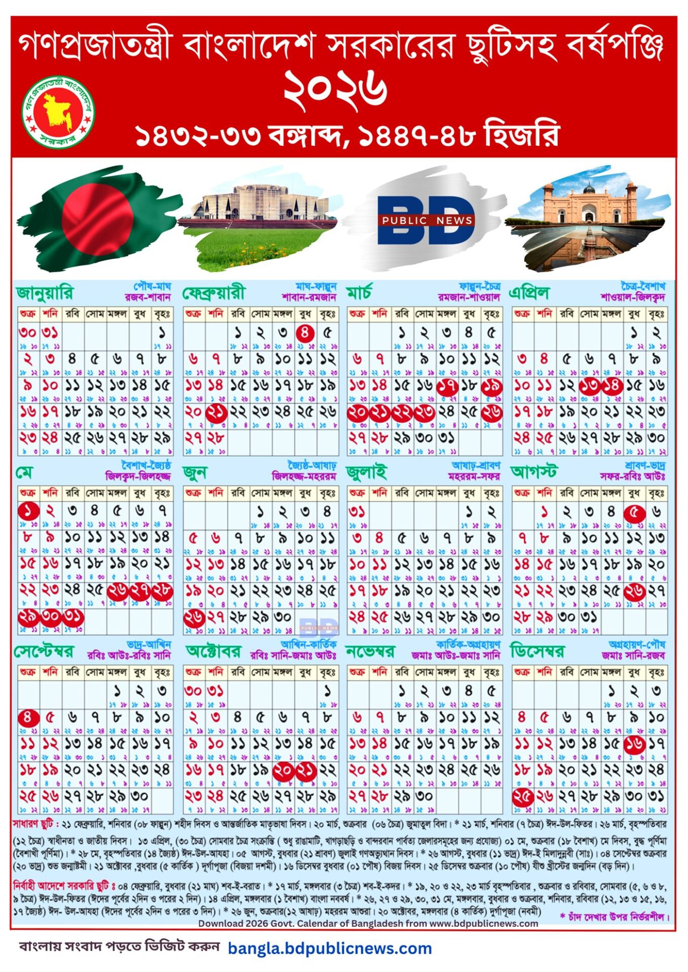 বাংলাদেশ ২০২৬ সালের সরকারি ছুটির ক্যালেন্ডার - BD 2026 Calendar of Public Holiday